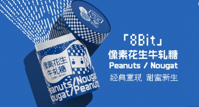 「8Bit像素牛轧糖」包装设计在保留经典牛轧糖格子纹饰和色系的基础上,融入了复古游戏机的像素感艺术表达,为传统花生牛轧糖打造全新IP形象,注入新生活力。